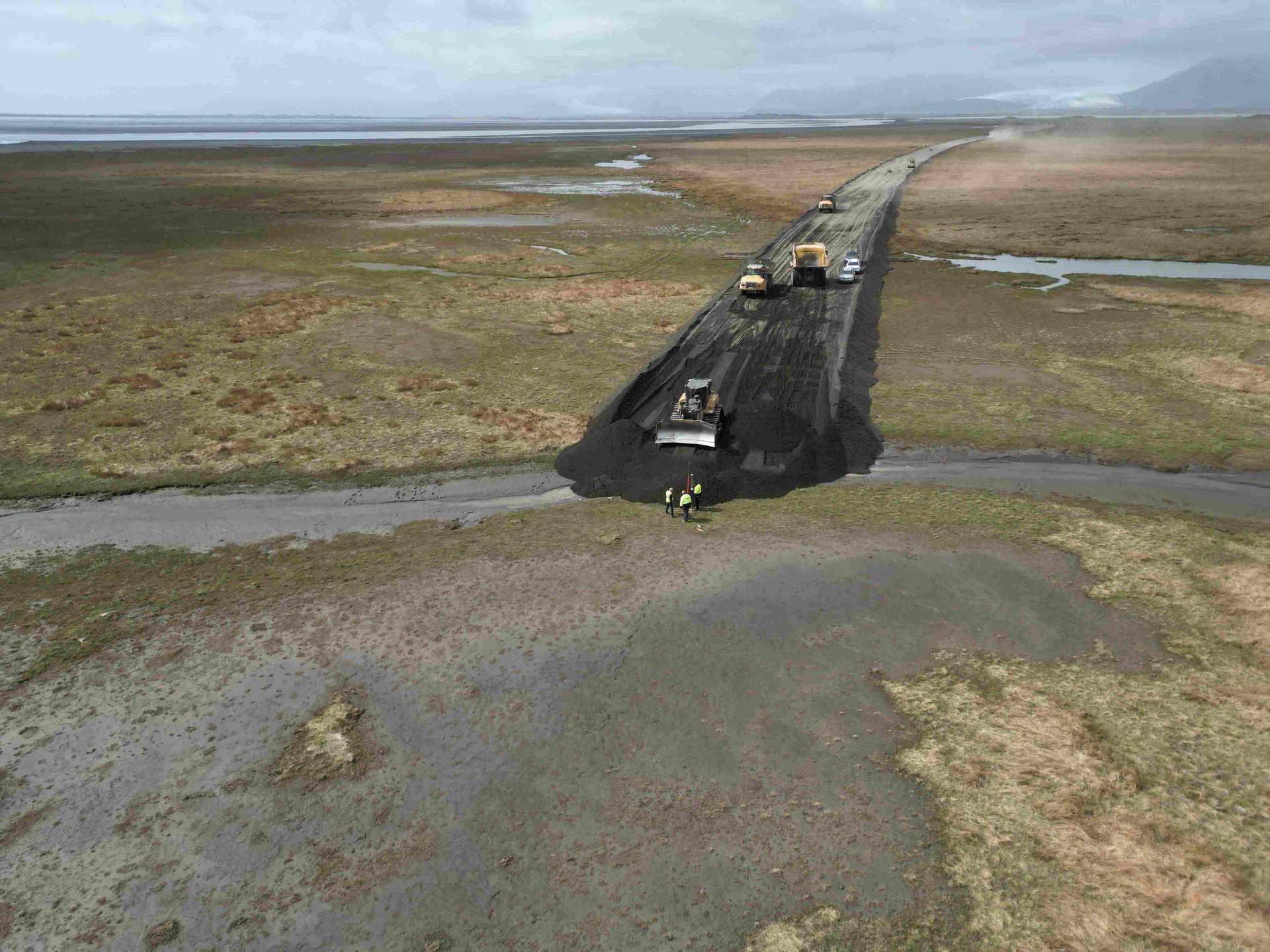 Það er góður gangur í verkinu eftir mikinn frost vetur og tala heimamenn um að þeir muni ekki eftir svona miklum frosthörkum í langan tíma. Því fylgdi síðan mikið vatnsveður með roki og seinna sandfoki. Áherslan hjá Ístak þessa dagana er að fylla í veginn til austurs svo hægt sé að komast að Hoffellsá. Búið er að fylla farglag á Djúpá og gera tengiveginn milli nýja þjóðvegar 1 og gamla þjóðvegar 1. Verið er að bíða eftir sigi í brúarstæði Hornafjarðaráar og eitt lag eftir þar. Þá er verið að vinna í farglagi í Bergá en það þarf á að standa í eitt ár, hinar styttra. Það er mikið af sigplötum sem þarf að setja niður og mæla reglulega. Verkstæðis skemma er að verða klár og verður það mikill munur fyrir starfsmenn, en það hefur truflað þjónustu við tækin að stundum er svo mikið sandfok að ekki er óhætt að opna viðkvæma hluti tækja. Við höfum náð að fylla um 70.000 m3 núna í maí. Við notum stórvirk tæki við framkvæmdina eins og sjá má á meðfylgjandi myndum. Brúarvinna hefst í haust þegar sigtími er liðinn.
