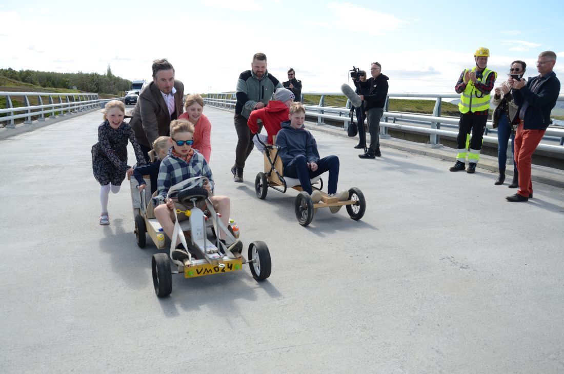 Hefð hefur verið fyrir því að ráðherra fari fyrstur yfir brýr eftir formlega opnun en í þetta sinn voru það börn af svæðinu sem fengu þann heiður en fararskjótarnir voru forlátir kassabílar sem þeir Haraldur og Jón ýttu yfir brúna.