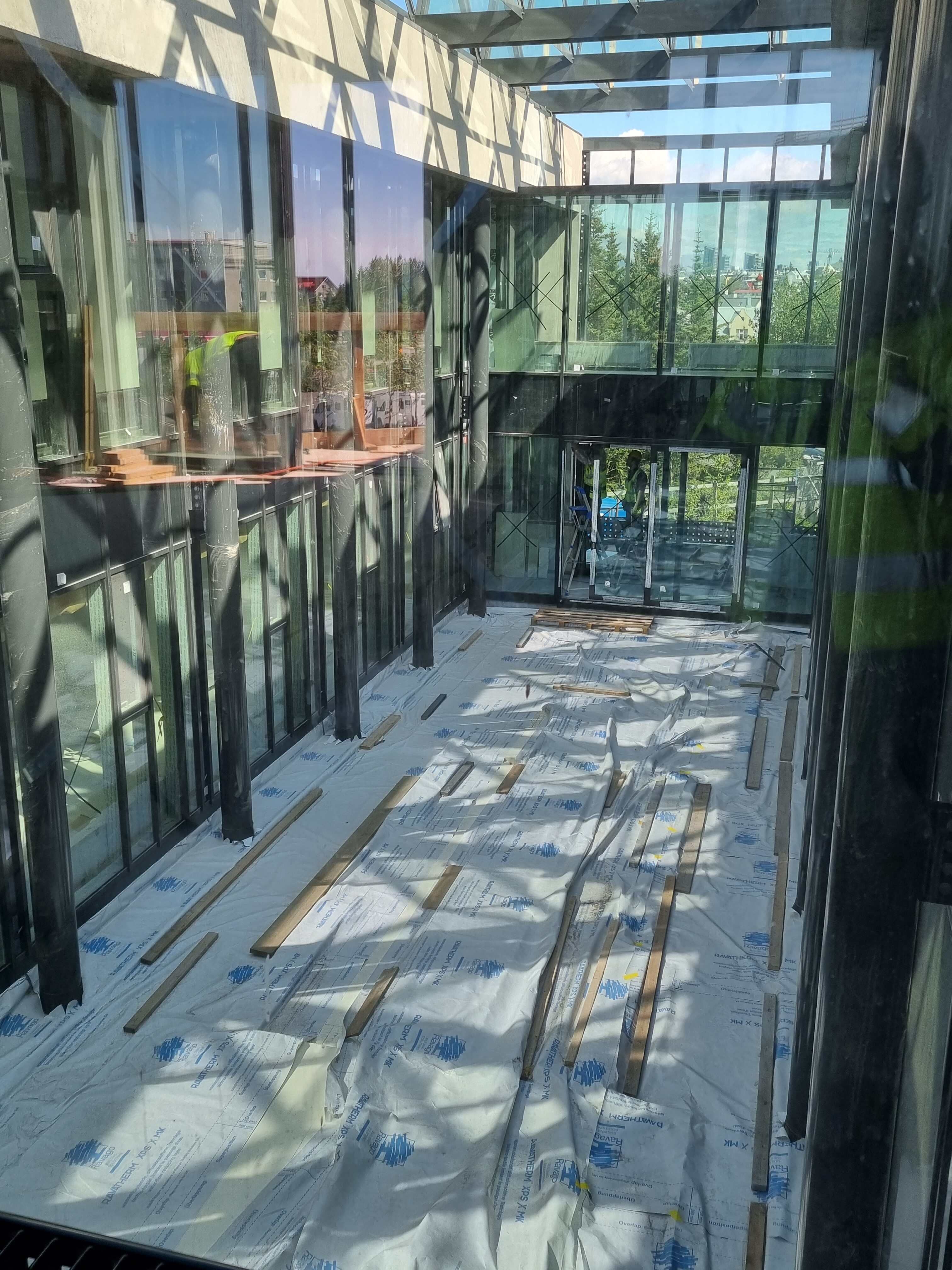 Verið er að innrétta á flestöllum hæðum, málningarvinnan er einnig í gangi, gólfvinna er að klárast á annarri og þriðju hæð. Uppsetning á innréttingum, glerskilrúmum, timburklæðningu og hurðum er á góðri leið. Einnig er verið að vinna í lögnum og rafmagni á öllum hæðum.