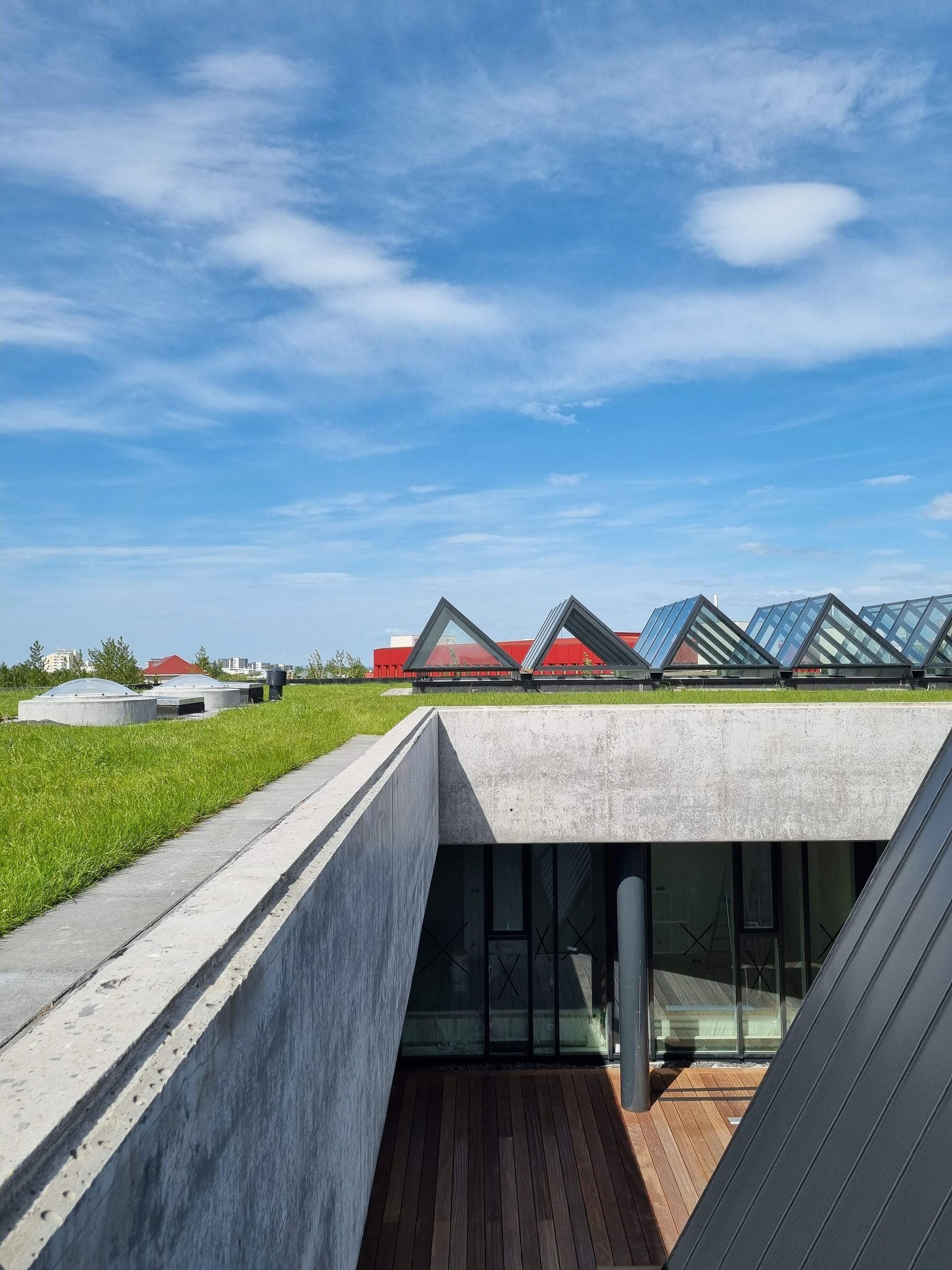 Staðan í dag er sú að búið er að steypa botnplötu tjarnar, unnið er að fyllingu að tjarnarkanti og steypa undir forsteyptar einingar í göngubrú í tjörn. Klæðningar utanhúss eru að klárast, hellulögn, kantsteinar, snjóbræðsla og vinna við þakkanta er í fullum gangi. Uppsetning á svalahandriðum hefst svo bráðlega.