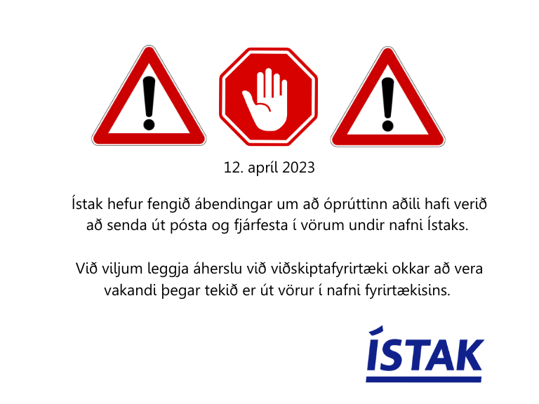 Við viljum leggja áherslu við viðskiptafyrirtæki okkar að vera vakandi þegar tekið er út vörur í nafni fyrirtækisins. Ef einhver vafi vaknar upp, hvetjum við fyrirtæki til að hafa samband og staðfesta starfsmann í síma 530-2700 eða á istak@istak.is.